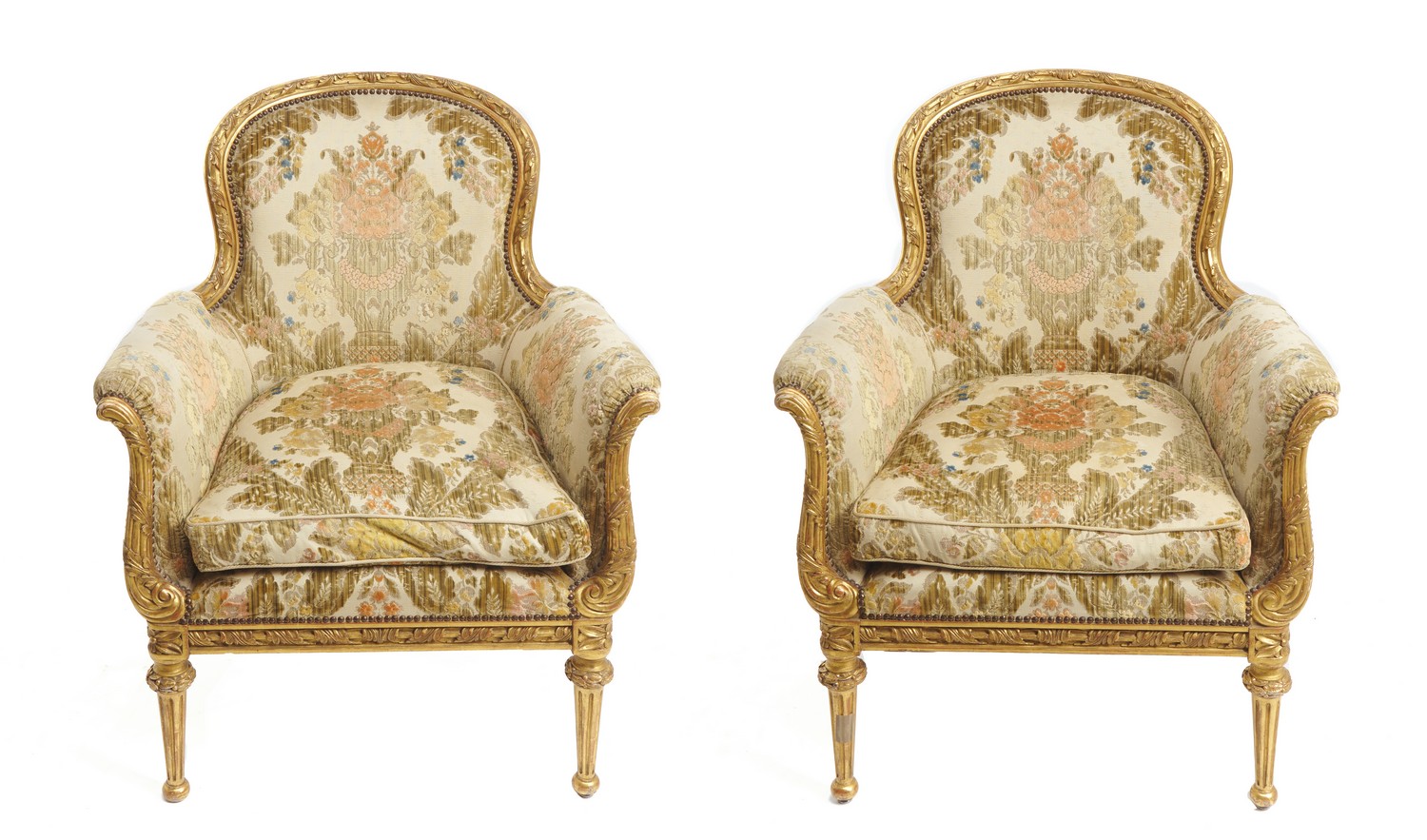 A PAIR OF LOUIS XV STYLE GILTWOOD FRAMED BERGÈRES