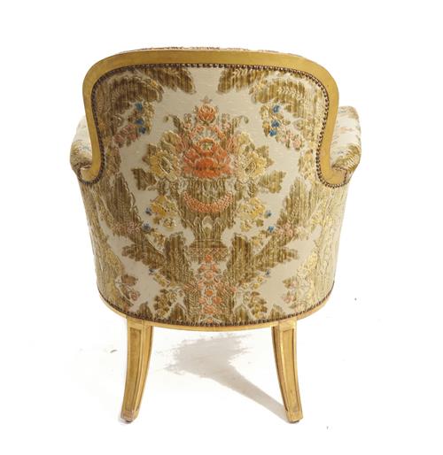 overall wear to giltwood frames, particularly to armrests and legs consistent with age and use. fabric in overall good condition- no visible tears. very minor stain to one small area on one chair. both chairs have seams that have separated between armrest and back. a small area of repair to back of one chair.