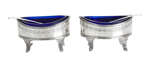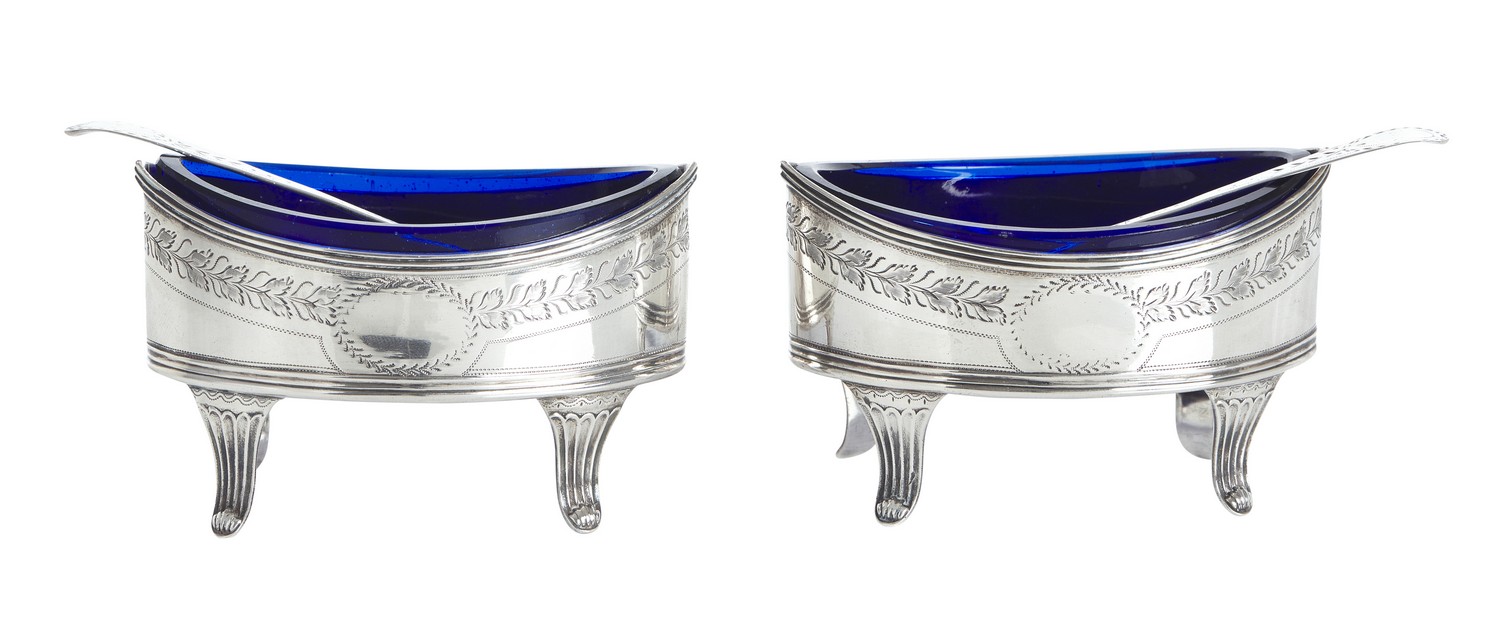 Each salt cellar of navette form, with bright cut garland border, raised on fluted legs with a blue glass liner. The spoons of typical form with bright cut decoration to handle.