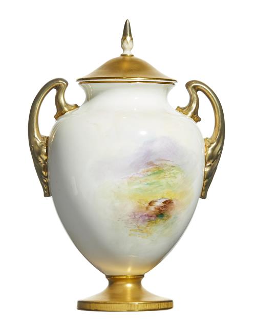 A ROYAL WORCESTER TWO HANDLED VASE AND COVER BY EDWARD TOWNSEND