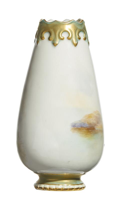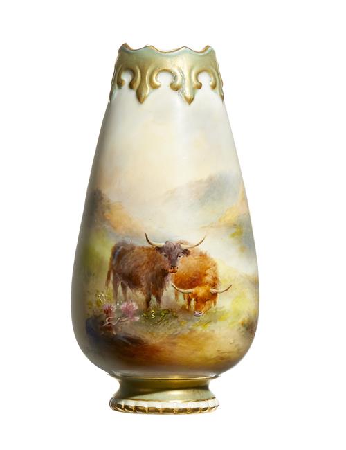 Painted with a pair of Highland cattle in a misty mountainous landscape. Printed factory marks. Shape number 1040 G.