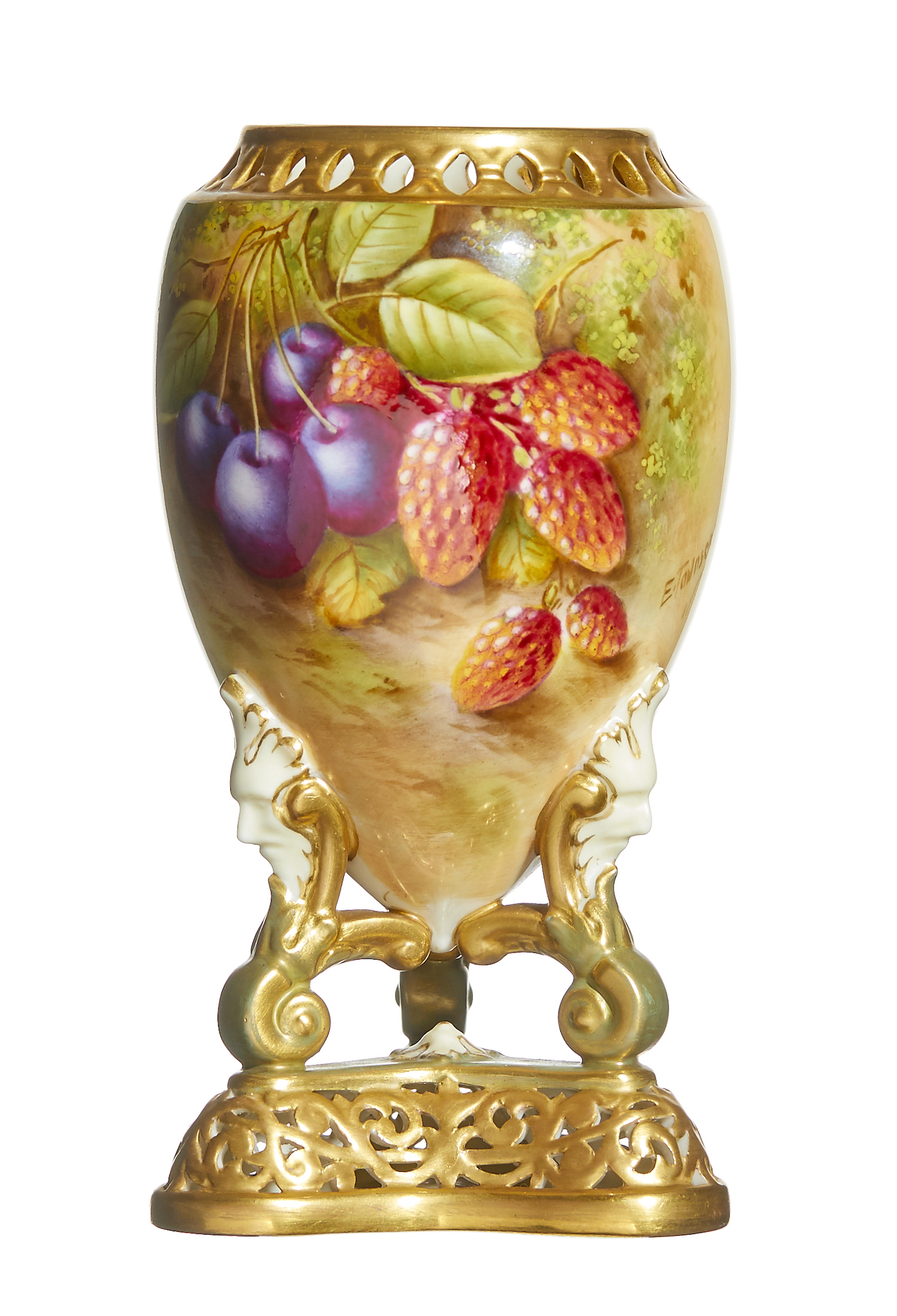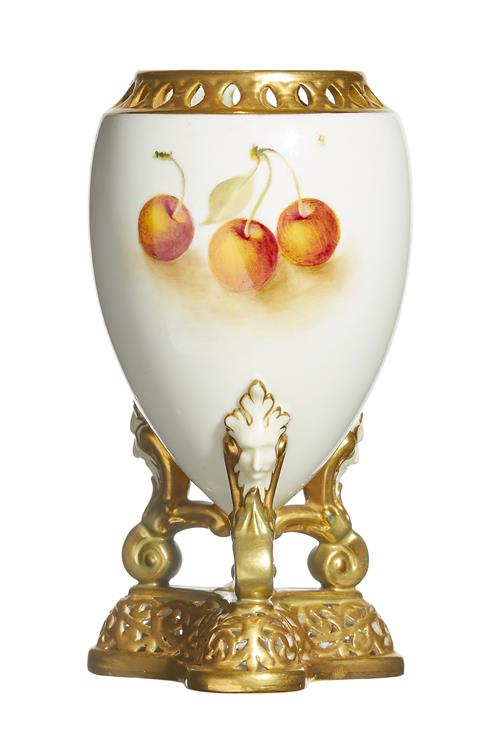 Painted with a still life of wild strawberries and cherries on a bank, set on three mask and scroll feet, the base and rim pierced. Printed factory marks. Shape number G733.