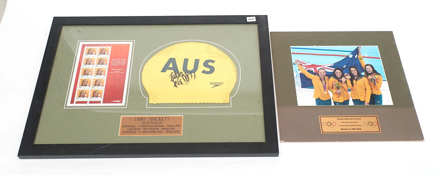 TWO AUSTRALIAN OLYMPIC GOLD RELATED MEMORABILIA. INCLUDING FRAMED LIBBY TRICKETT SIGNED SWIMMING CAP WITH STAMPS, AND A PHOTOGRAPH OF AUSTRALIA'S GOLDEN GIRLS OF THE POOL.