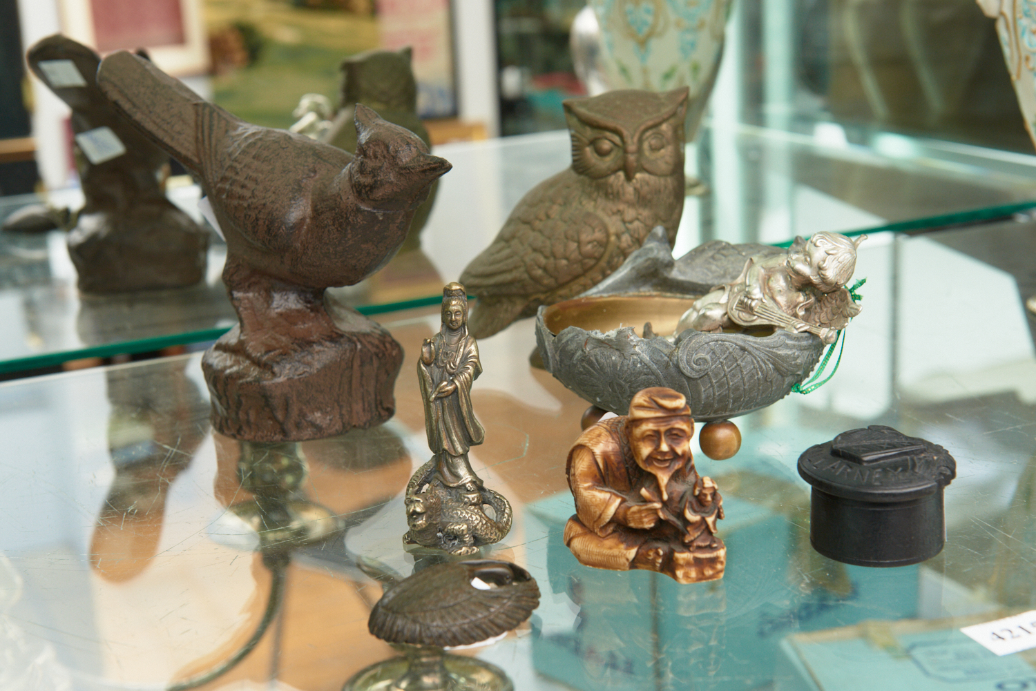 A COLLECTION OF METAL AND WOODEN NOVELTIES, INCLUDING FOUR FIGURAL AND ANIMALIA FIGURES, A BOWL SURMOUNTED BY A CHERUB FINIAL (DAMAGED), AN IRISH SOUVENIR WOODEN BOX AND COVER CARVED WITH A HARP AND A WOODEN PLAQUE IN THE FORM OF A BIRD