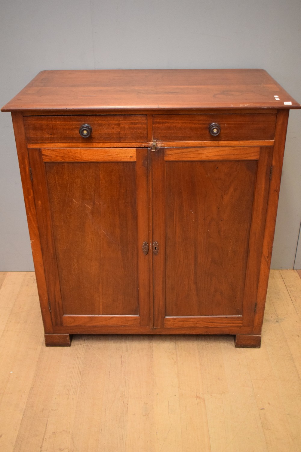 A 19TH CENTURY CEDAR TWO DOOR CABINET WITH TWO INTERNAL SHELVES (117H X 108W X 66D CM) (PLEASE NOTE THIS ITEM MUST BE REMOVED BY CLIENTS OR CARRIERS AT THE CUSTOMERS EXPENSE)