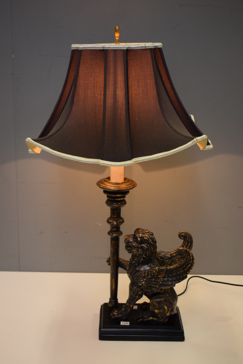 A GILT AND BLACK PAINTED TABLE LAMP DEPICTING A GRIFFON (88 CM H)