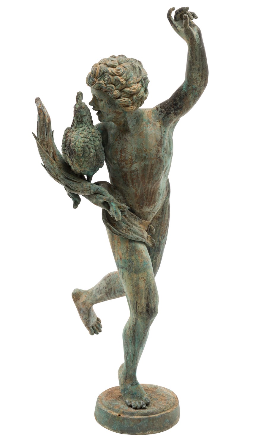 The verdigris patinated hollow bronze figure modelled as a young boy holding a rooster in one hand and the other hand held aloft, on a circular base. Modelled after 'Winner of the cock fight' by Jean-Alexandre-Joseph Falguerie.