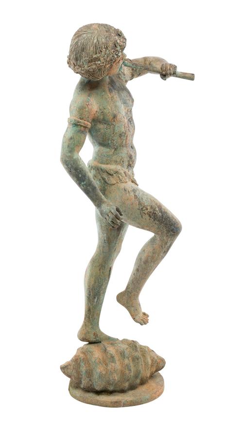 The verdigris patinated hollow bronze figure modelled as a pan holding a flute in one hand, standing on a shell with one leg raised, on a circular base.