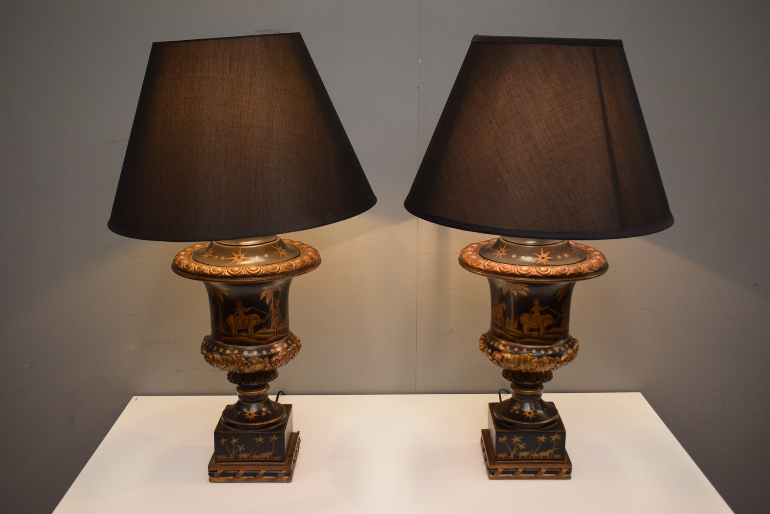 A PAIR OF CLASSICAL STYLE BLACK TABLE LAMPS WITH GOLD DETAILING (81H X 49D CM)