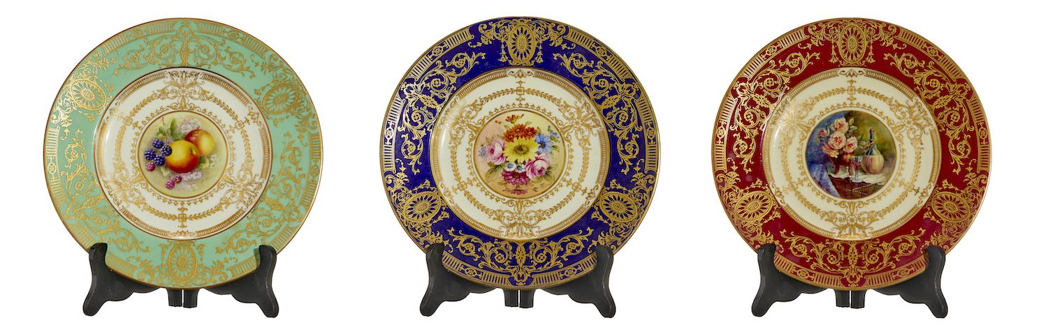 Each with a painted central medallion, one of fruit and blossom, one of summer flowers, and one of a still life of flowers on a table with a wine bottle and glass, with gilt surround and broad gilt and coloured outer band. Printed factory marks.