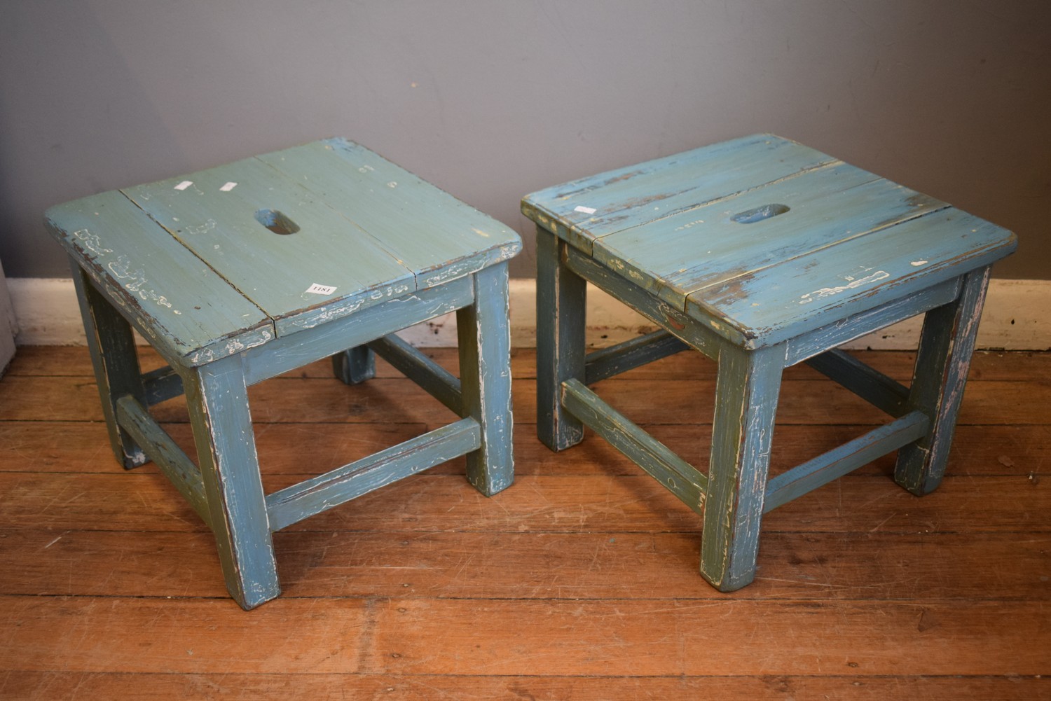 A PAIR OF BLUE PAINTED TIMBER STOOLS (33H X 39D X 39W CM)