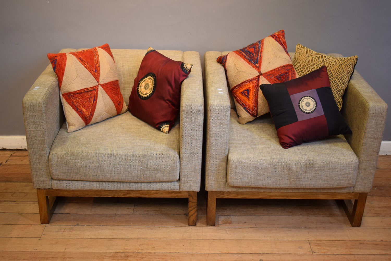 A PAIR OF UPHOLSTERED ARMCHAIRS WITH CUSHIONS (73H X 87W X 86D CM)