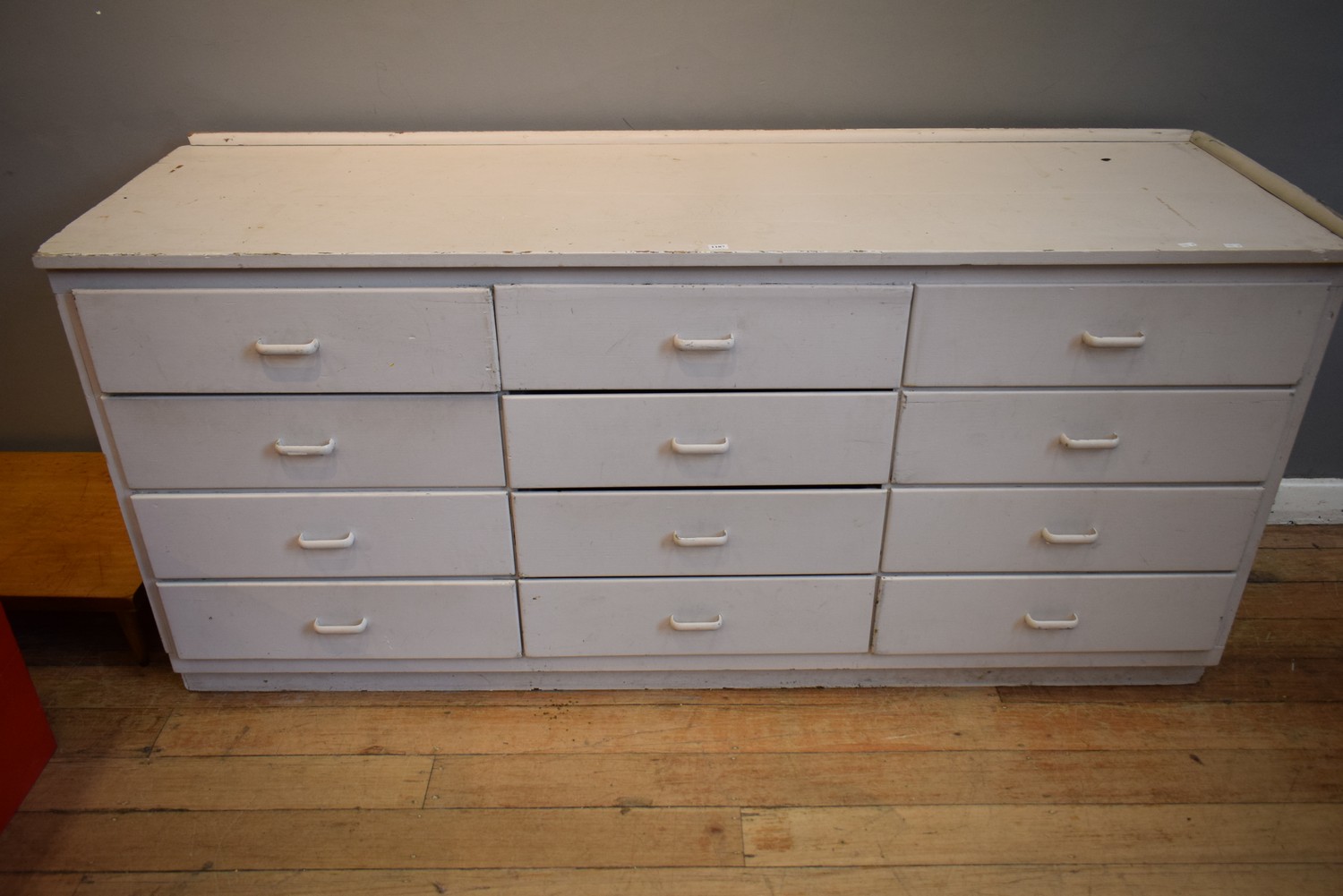 A TWELVE DRAWER WHITE PAINTED SET OF DRAWERS (82H X 173W X 53D CM) (PLEASE NOTE THIS ITEM MUST BE REMOVED BY CLIENTS OR CARRIERS AT THE CUSTOMERS EXPENSE)