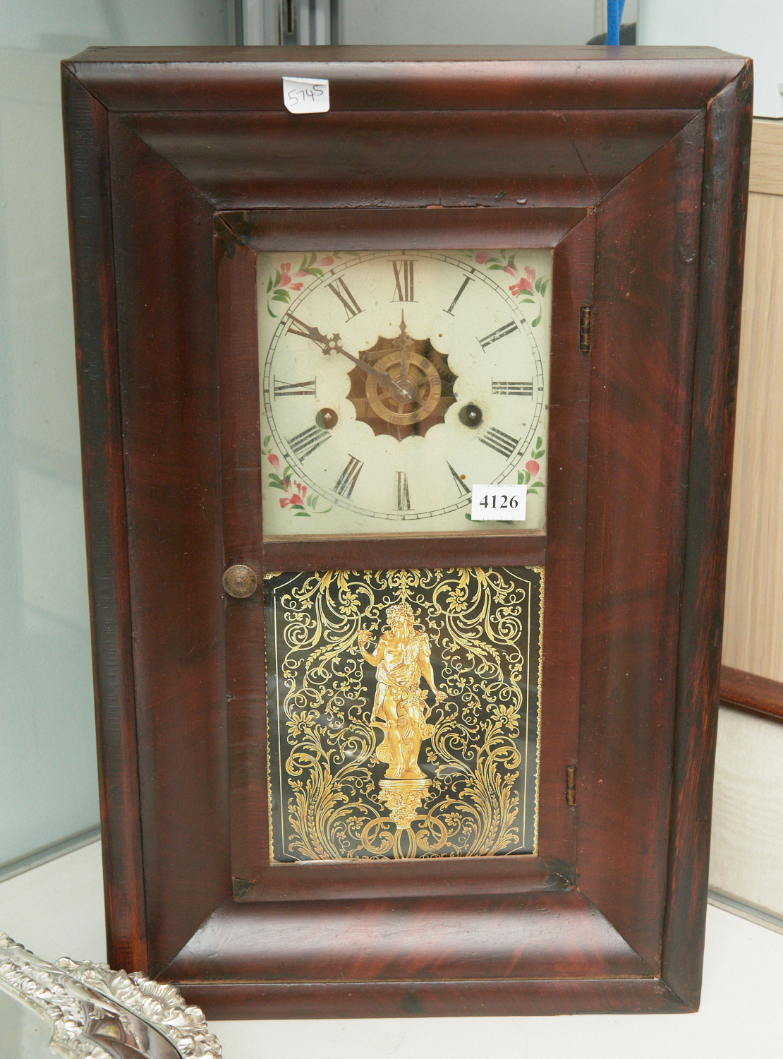A HARDWOOD CASED COTTAGE CLOCK, INSET WITH A CLASSICALLY INSPIRED GILDED GLASS PANEL, 46 CM HIGH, 29 CM WIDE, 10 CM DEPTH