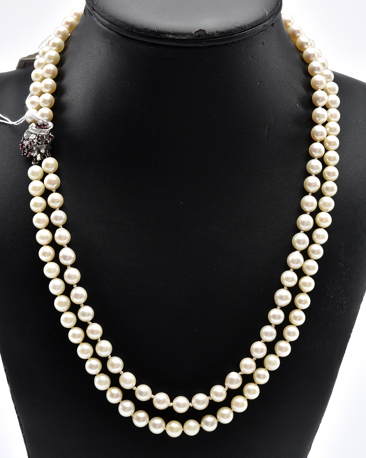 A DOUBLE STRAND OF CULTURED PEARL, THE CLASP SET WITH RUBY AND DIAMONDS IN 14CT WHITE GOLD, TOTAL LENGTH 570MM APPROXIMATELY