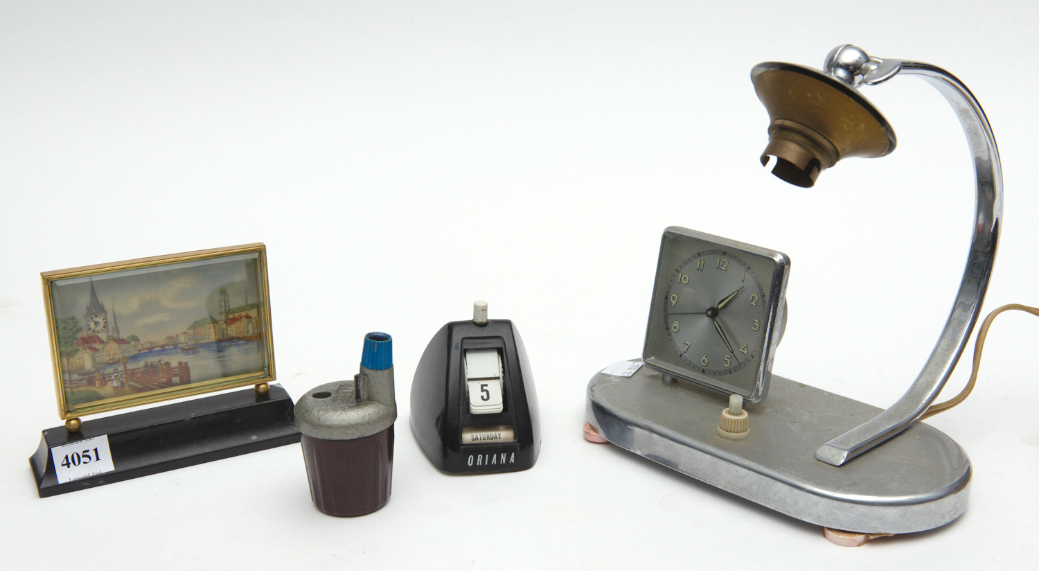 FOUR VINTAGE DESK ACCESORIES, INCLUDING A NICKEL PLATED COMBINATION DESK LAMP AND CLOCK (ONE FOOT TO THE UNDERSIDE OF THE BASE A/F), A JAPANESE BAKELITE DESK CALENDAR, A GERMAN BAKELITE AND CAST METAL PENCIL SHARPENER AND A NOVELTY PICTORIAL ALARM CLOCK