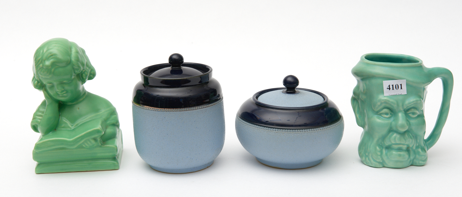 TWO ENGLISH POWDER BLUE AND NAVY GLAZED STONE WARE LIDDED JARS, A GREEN MATT GLAZED CERAMIC 'FALSTAFF' TOBY JUG AND A SIMILARLY GLAZED GREEN CERAMIC FIGURE OF A CHILD READING