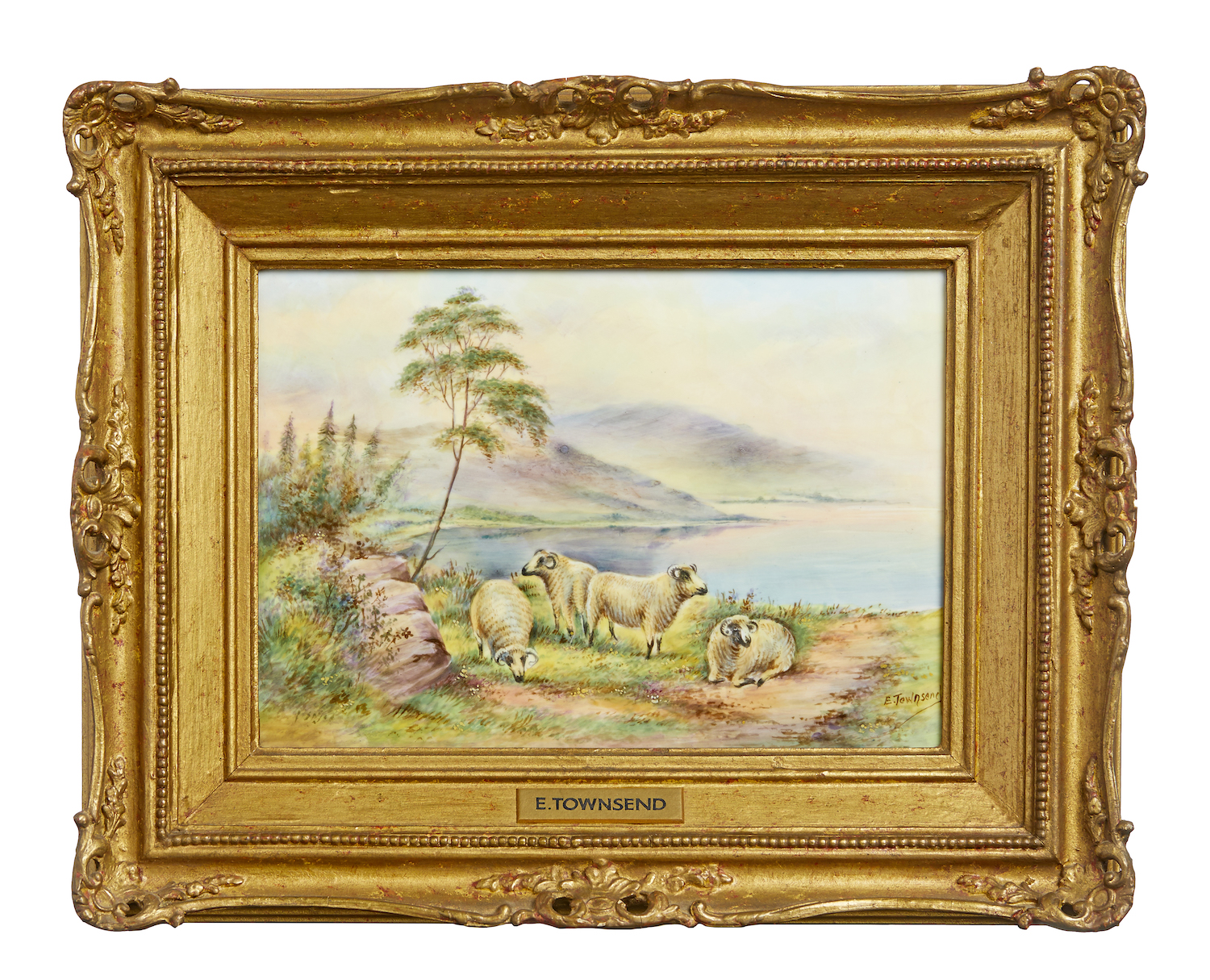 Finely painted with four Highland sheep in a mountainous landscape beside a loche. Printed factory mark. Artist signature in gold to back.