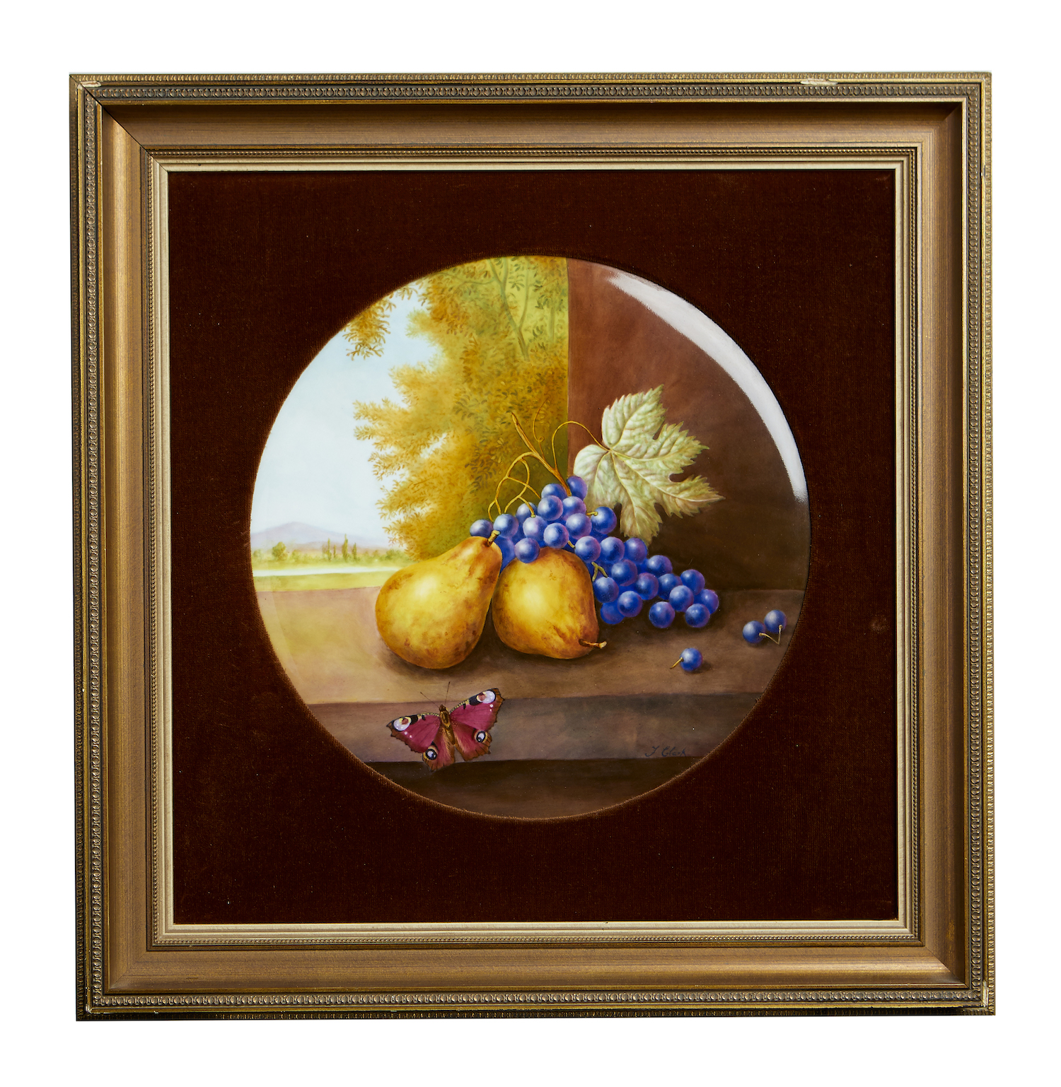 Painted with a still life of fruit on a sill, a butterfly hovering below, a landscape beyond. Dyson Perrins Museum paper label certificate of authenticity signed by Henry Sandon of The Royal Worcester Porcelain Company.
