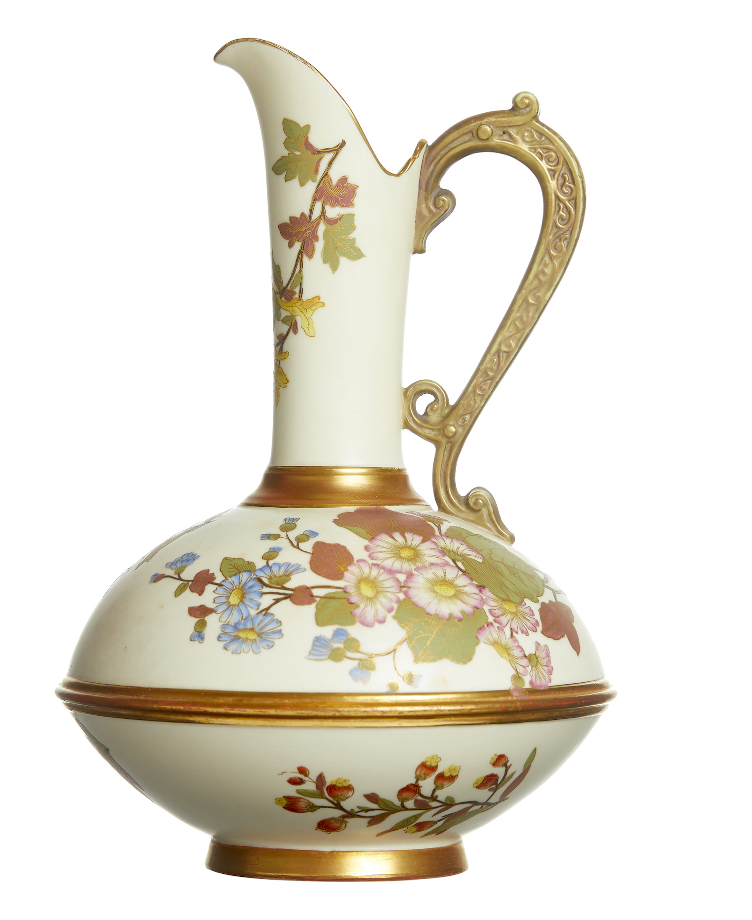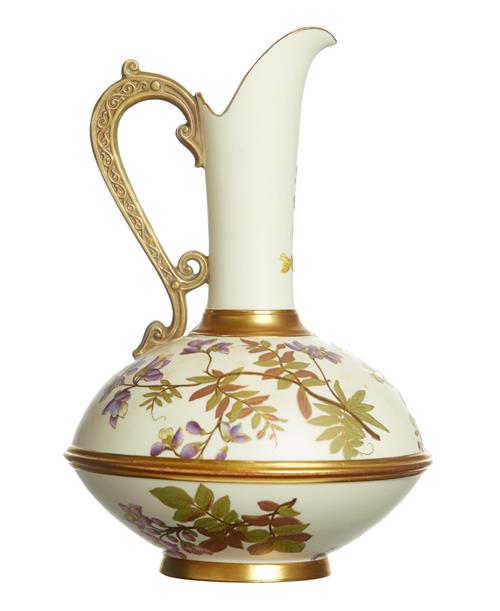 Decorated with wild flowers on a blush ivory ground with gilt borders and handle. Printed factory marks. Shape number 1162.
