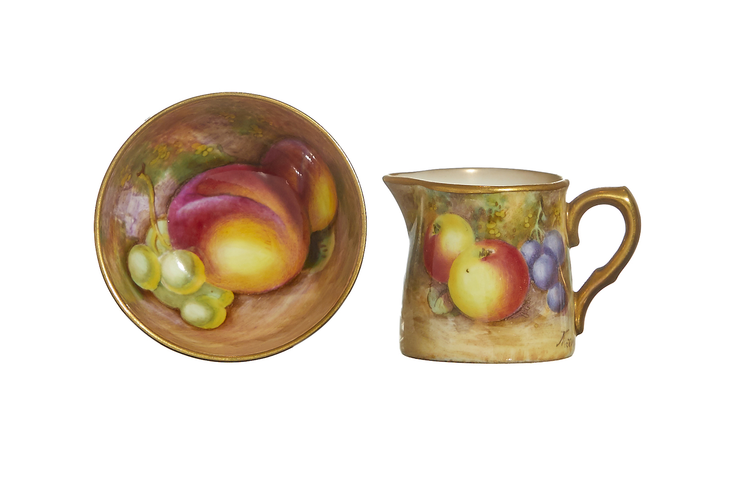 Painted with fruits and berries in a woodland landscape. Printed factory mark.