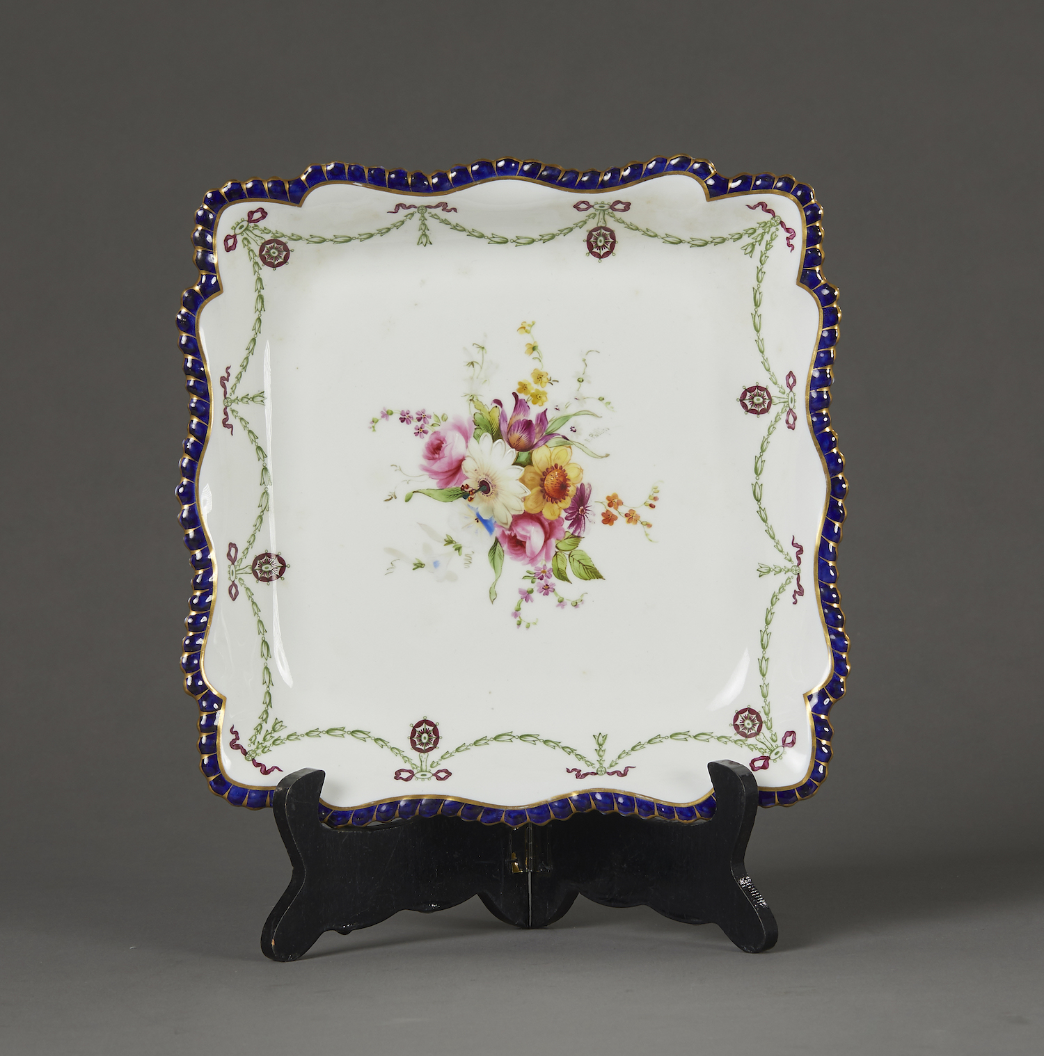 Painted with a central reserve of colourful wild flowers, the crimped and scalloped edge richly decorated in dark blue with swags and bows. Printed factory mark, pattern code W6528.