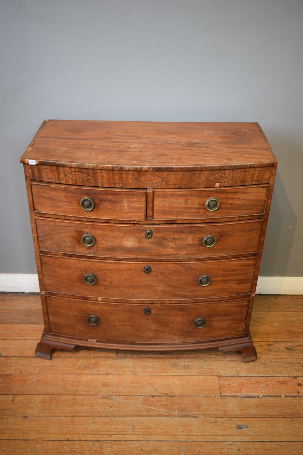 A REGENCY MAHOGANY FIVE DRAWER BOW FRONTED CHEST (A/F) (98H X 93W X 48D CM)