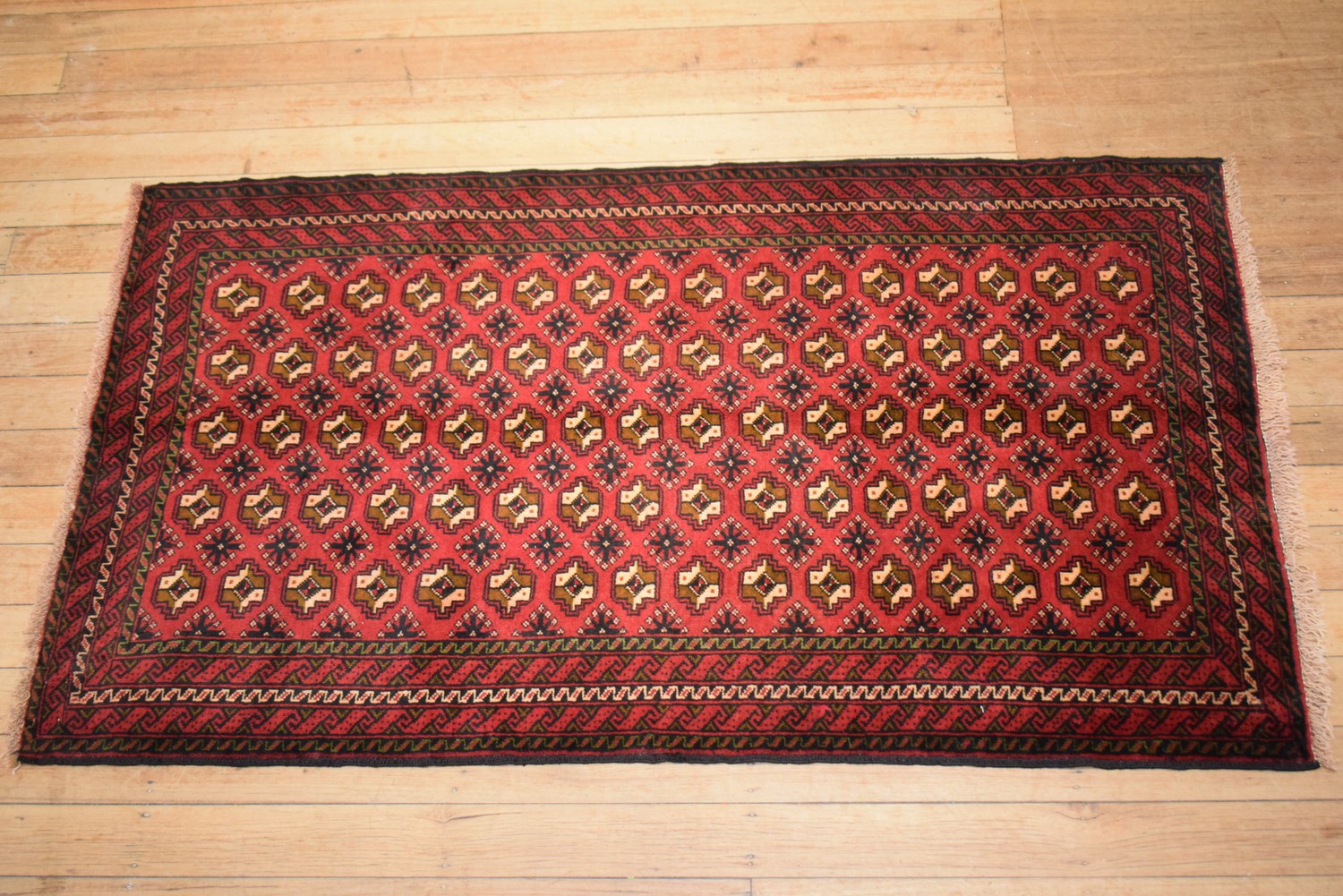 A FINE TRIBAL PERSIAN TURKOMAN RUG. 100% WOOL PILE. EX-GALLERY STOCK. IN EXCELLENT CONDITION. FINELY HAND-KNOTTED TRIBAL WEAVE WITH TRADITIONAL DESIGN OF ALL-OVER TURKOMAN GUL MOTIFS SET WITHIN A RED FIELD. CERTIFICATE OF AUTHENTICITY INCLUDED. SIZE: 196X110CM, ORIGIN: PERSIA – RRP: $1,300