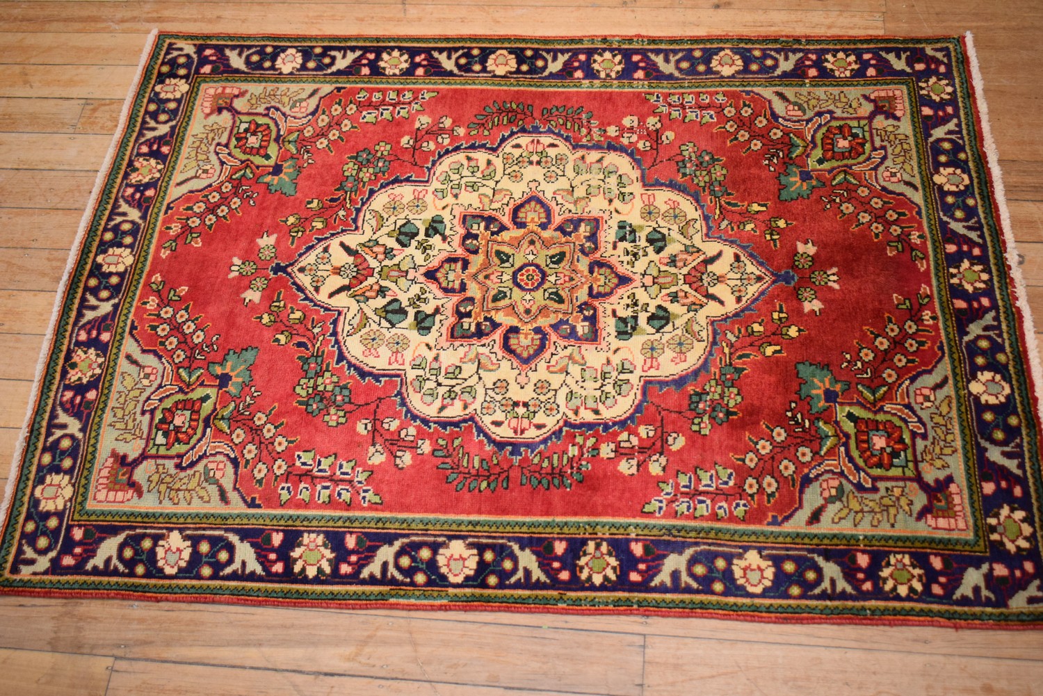 A VINTAGE PERSIAN TABRIZ MARAND CARPET. 100% WOOL. VINTAGE PILE. IN GOOD CLEAN CONDITION. HAND-KNOTTED AND WITH CLASSIC TABRIZ DESIGN OF BOLD FLORAL MEDALLION AND QUARTERED CORNER MEDALLIONS WITH FLORAL SPRAYS SET WITHIN AN OPEN RED FIELD. BORDER OF PALMETTES & TENDRILS. CERTIFICATE OF AUTHENTICITY INCLUDED. SIZE: 195X142CM, ORIGIN: PERSIA – RRP: $1,600