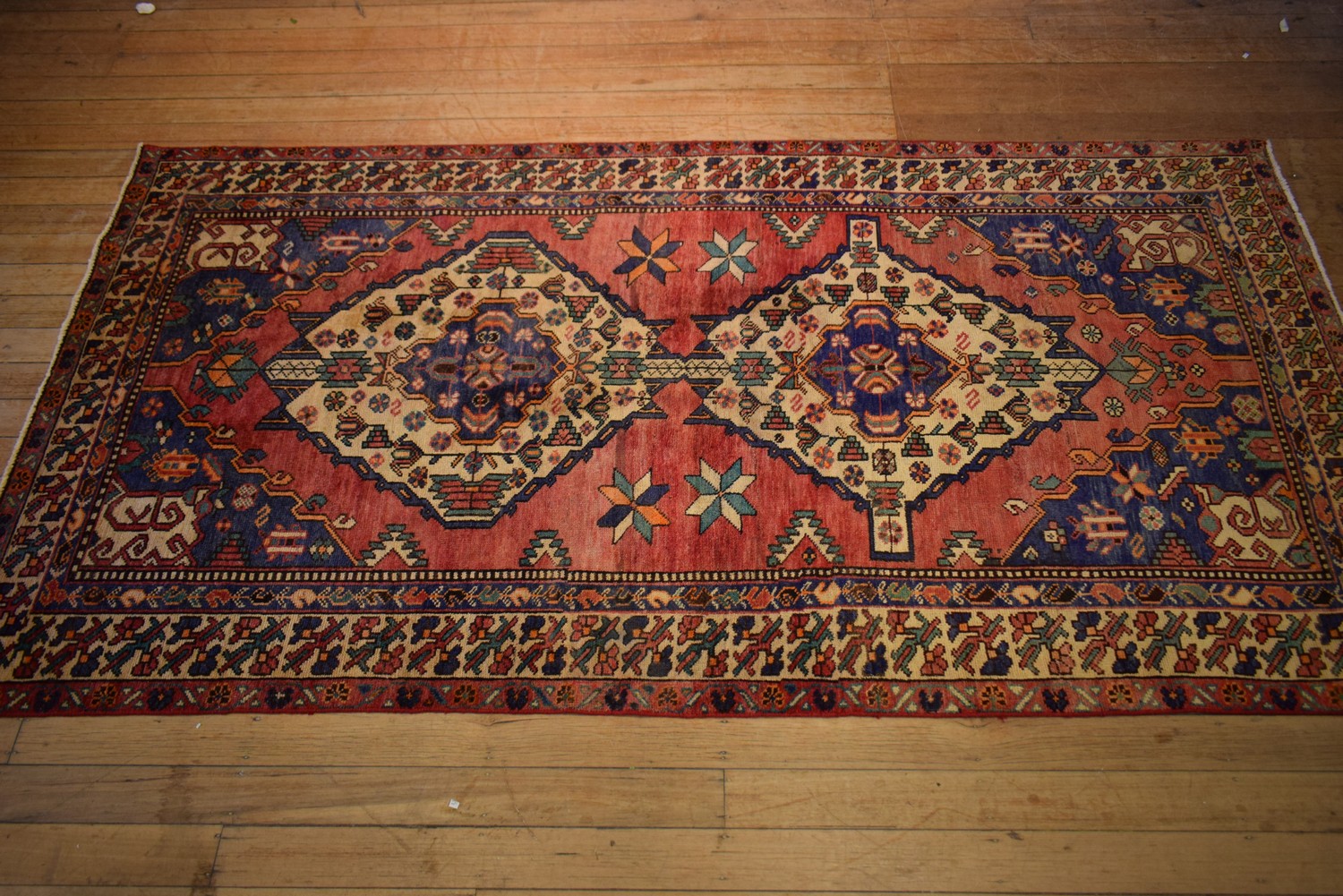 A TRIBAL PERSIAN BAKHTIAR RUG. 100% WOOL. EX-GALLERY STOCK. IN EXCELLENT CONDITION. FULLY RESTORED FRINGES. HAND-KNOTTED TRIBAL WEAVE WITH TRADITIONAL DESIGN OF DOUBLE BOLD & HOOKED MEDALLIONS & CORNER MEDALLIONS INA RED-TONED FIELD OF FLORAL PATTERNS & PAISLEY MOTIFS. FLORAL-PATTERNED BORDER. CERTIFICATE OF AUTHENTICITY INCLUDED. SIZE: 313X161CM, ORIGIN: PERSIA – RRP: $2,800