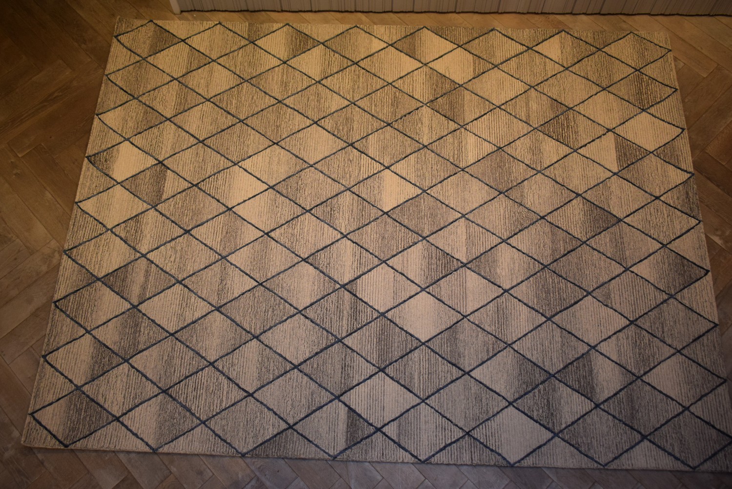 A LARGE & BRAND-NEW MODERN DESIGNER CARPET. HAND-TUFTED. WOOL PILE AND SILKY VISCOSE INLAYS. MODERN DESIGN OF EMBOSSED BLUE-TONED DIAMOND-SHAPED PANELS SET WITHIN A CREAM & DARK GREY BACKGROUND. SIZE: 360 X 270CM, ORIGIN: INDIA – RRP: $2,900