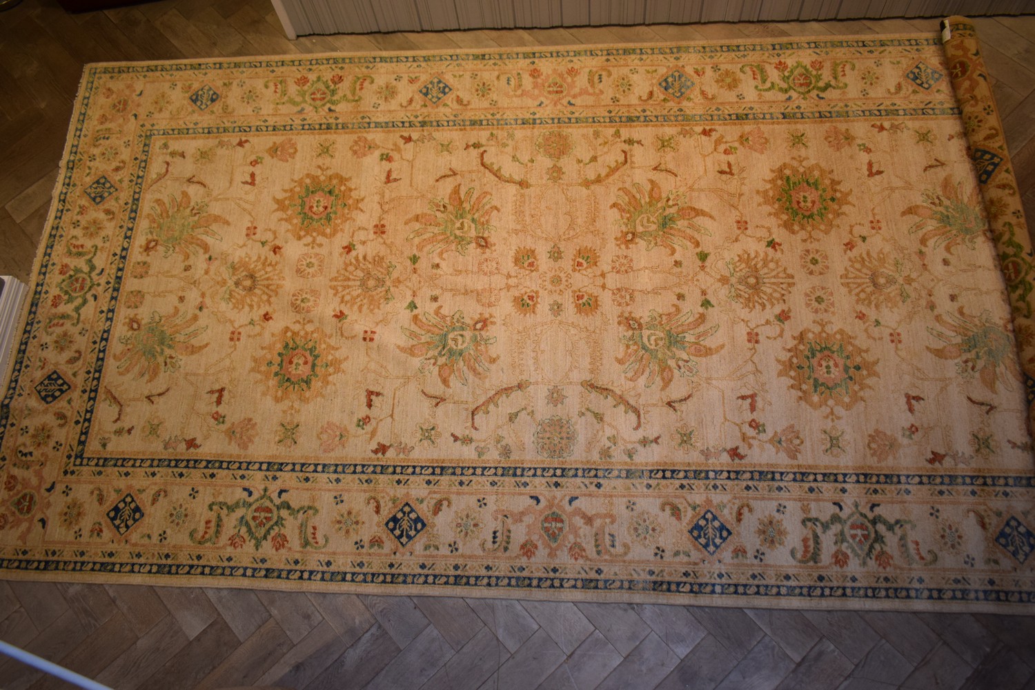 AN EXTRA-LARGE & RARE-SIZED SULTANABAD CARPET. HAND-SPUN WOOL. VEGETABLE DYES. SOLID & HARD-WEARING. HAND-WOVEN BY TURKOMAN WEAVERS OF AFGHANISTAN IN BORDER AREAS OF PAKISTAN WITH TRADITIONAL DESIGN OF ALL-OVERBOLD PALMETTES, FLORAL PATTERNS AND TENDRILS IN A CREAM FIELD. IN EXCELLENT CLEAN CONDITION. SIZE: 503CMx276CM, ORIGIN: AFGHANISTAN – RRP: $12,000