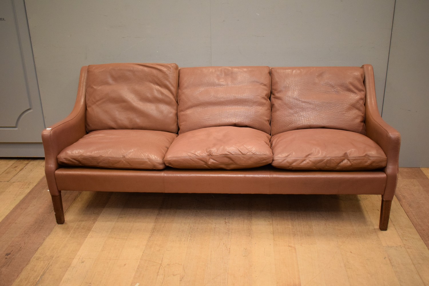 A DANISH BROWN LEATHER THREE SEATER SOFA (A/F CAT SCRATCHES AND SUN FADING) (73H X 180W X 76D CM)