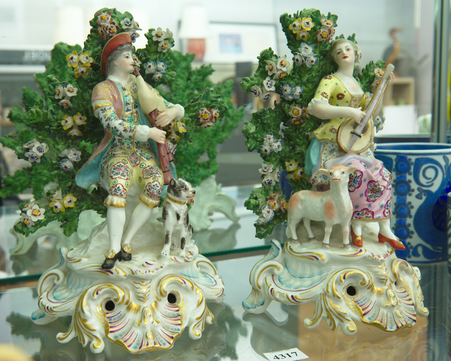 Modelled in the manner of the Chelsea porcelain factory, each figures raised on shell cap and scroll bases, no factory marks.