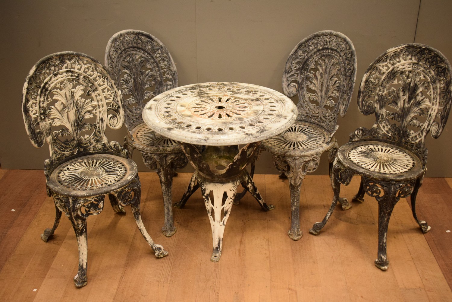 A FIVE PIECE METAL VICTORIAN STYLE GARDEN SETTING (TABLE 63H X 69D CM)