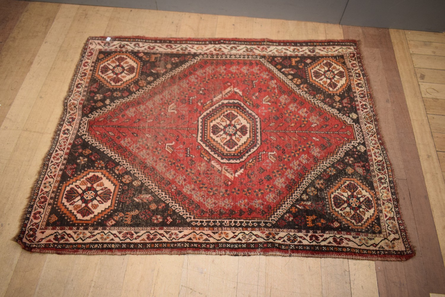 A PERSIAN VINTAGE HAMADAN RUG, 100% WOOL, APPROX 80 YEARS OLD (A/F) (156 X 122 CM)