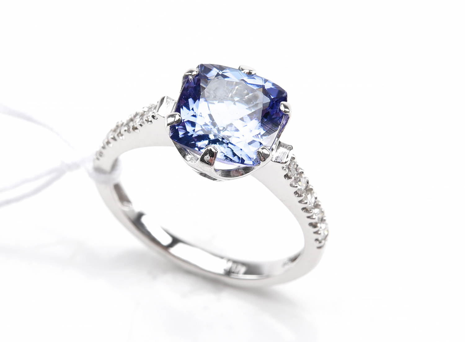 A CUSHION CUT TANZANITE AND DIAMOND DRESS RING IN 18CT WHITE GOLD, SIZE M