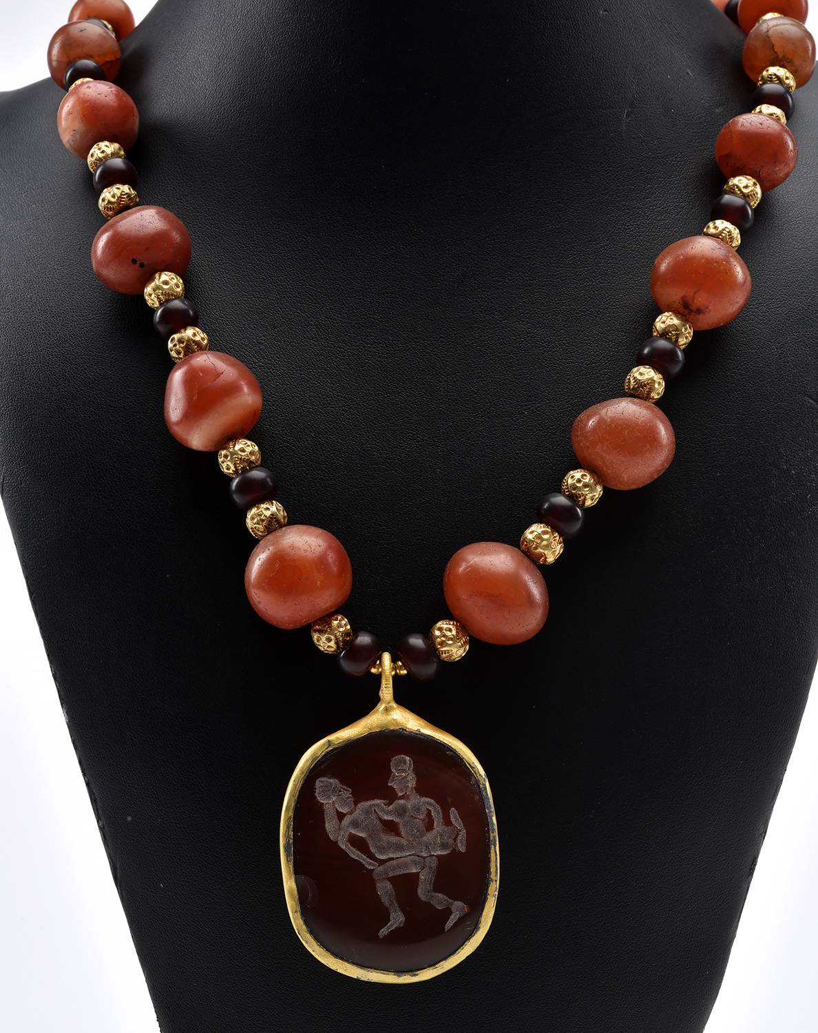 AN ETRUSCAN STYLE AGATE NECKLACE, THE CARVED AGATE PENDANT DEPICTING AN EROTIC FIGURE, WITH FURTHER BRASS DETAILS
