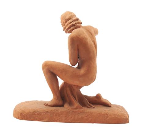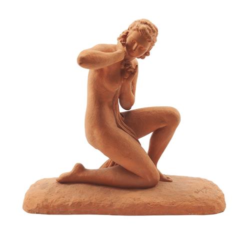 Modelled as a semi- nude female, kneeling on a rounded rectangular base. Signed U. Cipriani, and impressed 'Terre Cuite D'arte' to verso.