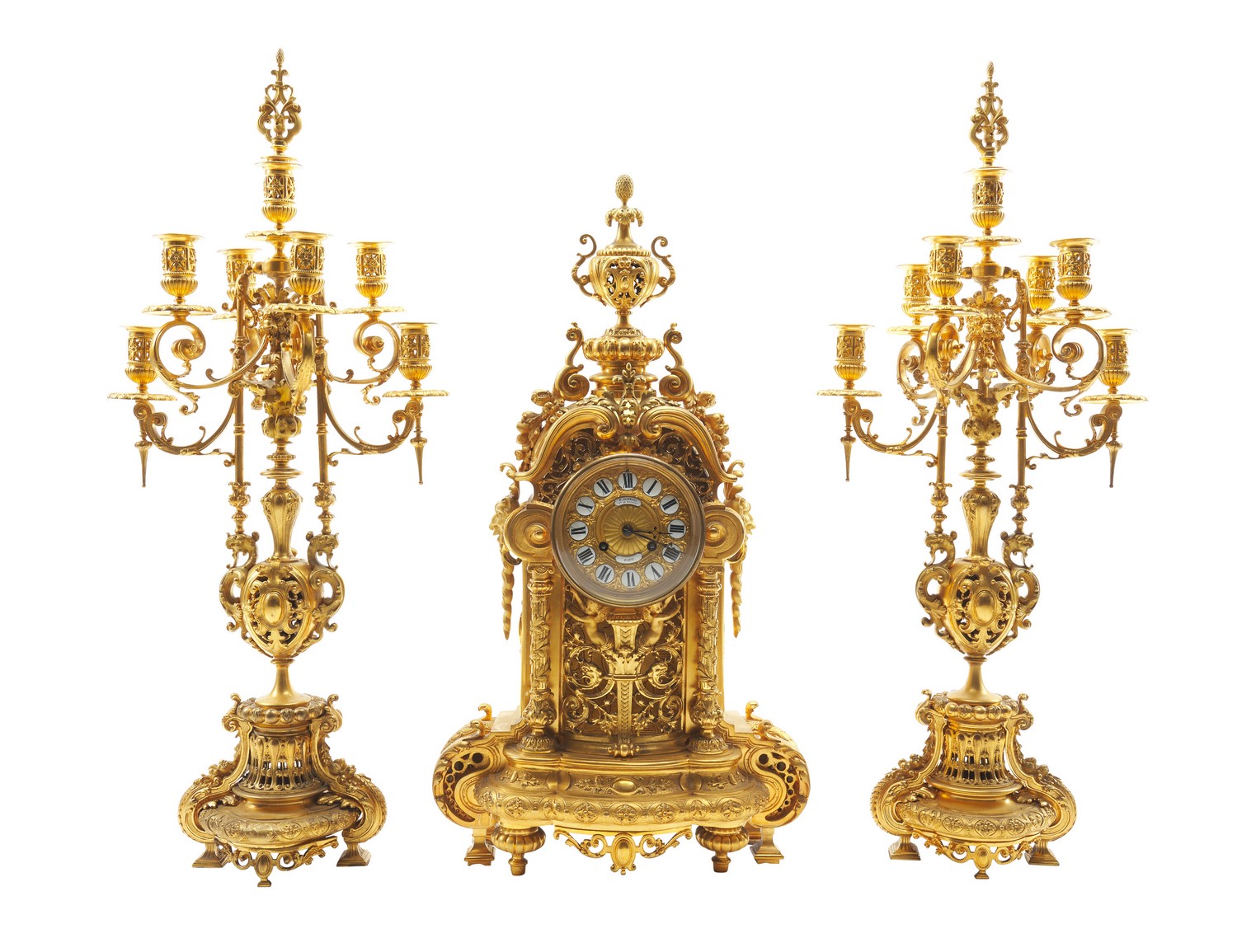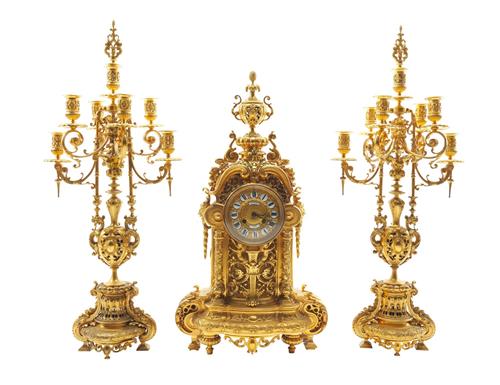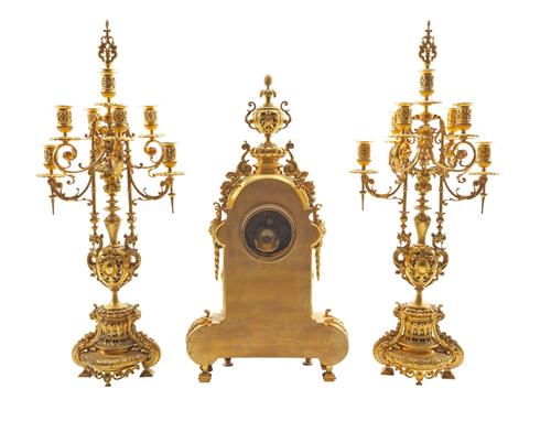 A FINELY CAST CONTINENTAL ORMOLU BRONZE CLOCK GARNITURE