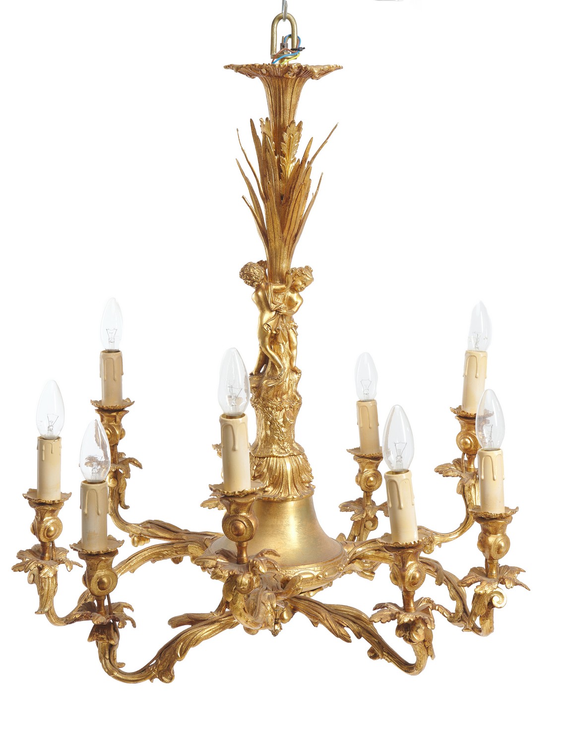 The finely cast ormolu bronze chandelier with a figural stem with three foliate arms bearing sconces, modelled in Rococo revival taste.