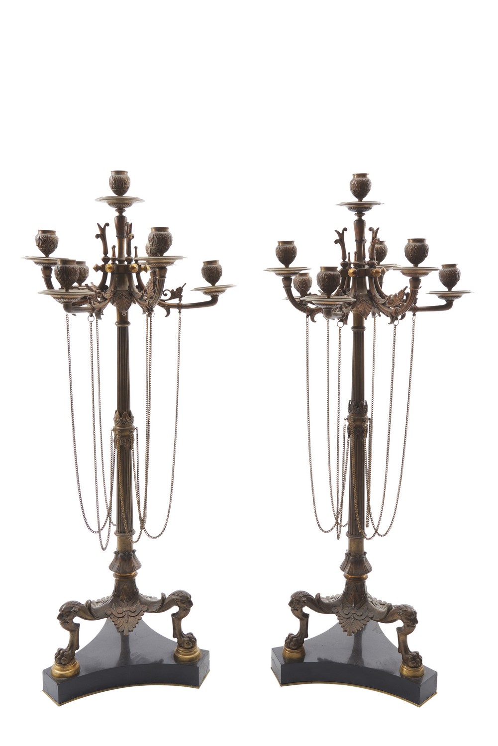 A LARGE PAIR OF FRENCH EMPIRE PARCEL-GILT BRONZE CANDELABRA
