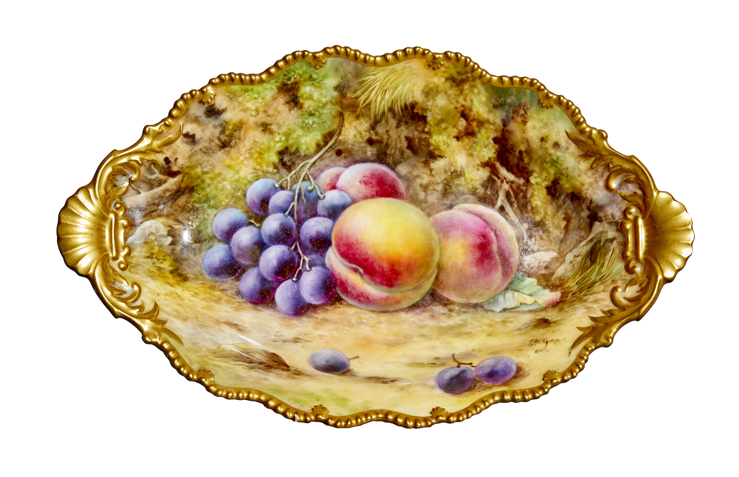 Painted with ripening fruits lying on a woodland bank, shaped gadroon gilt border. Printed factory marks. Shape number C55.