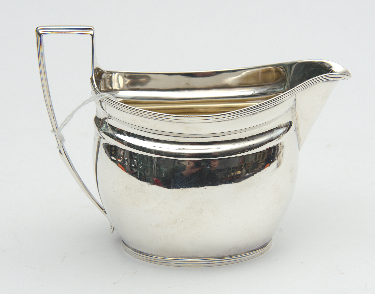 A GEORGE III STERLING SILVER CREAMER, MAKER'S MARK RUBBED, LONDON, 1800, WITH A FLATTENED OVOID BODY, FLANKED BY AN ANGULAR HANDLE, APPROXIMATELY 153 GMS TOTAL WEIGHT OF SILVER, 14.5 CM WIDE, 11 CM HIGH, 7 CM DEPTH