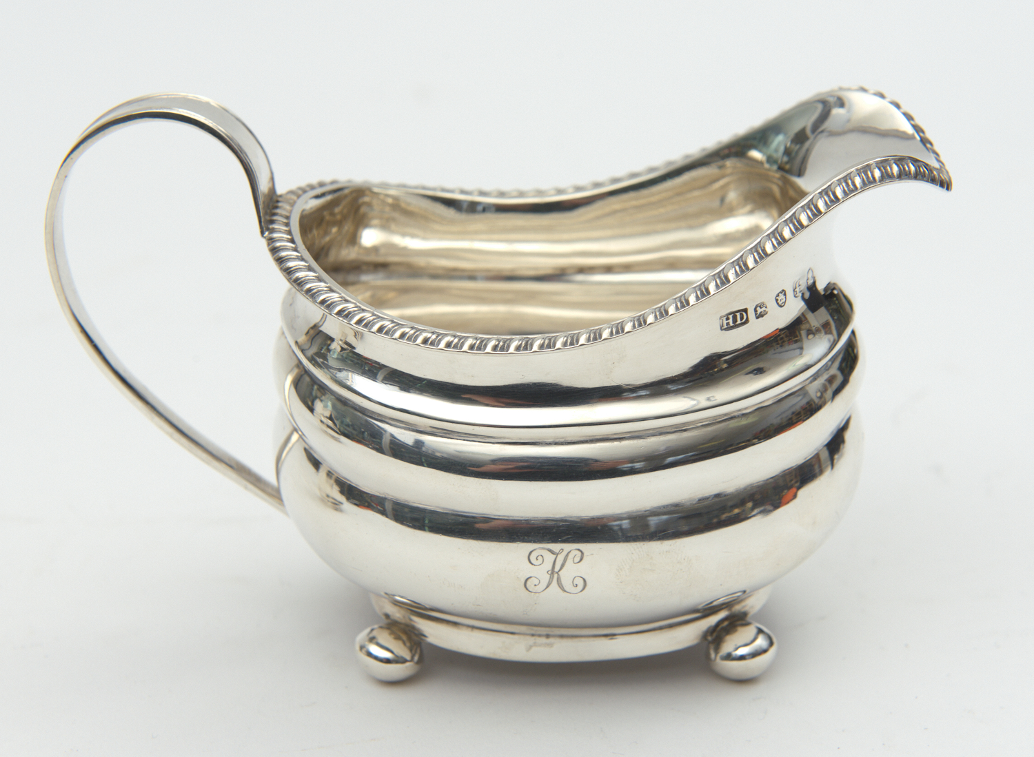 A GEORGE IV STERLING SILVER CREAMER, PROBABLY JAMES HENRY DANIEL, LONDON, 1821, WITH A GADROONED RIM, A SCROLL HANDLE AND BUN FEET, APPROXIMATELY 155 GMS TOTAL WEIGHT OF SILVER, 9 CM HIGH, 14 CM WIDE, 8 CM DEPTH