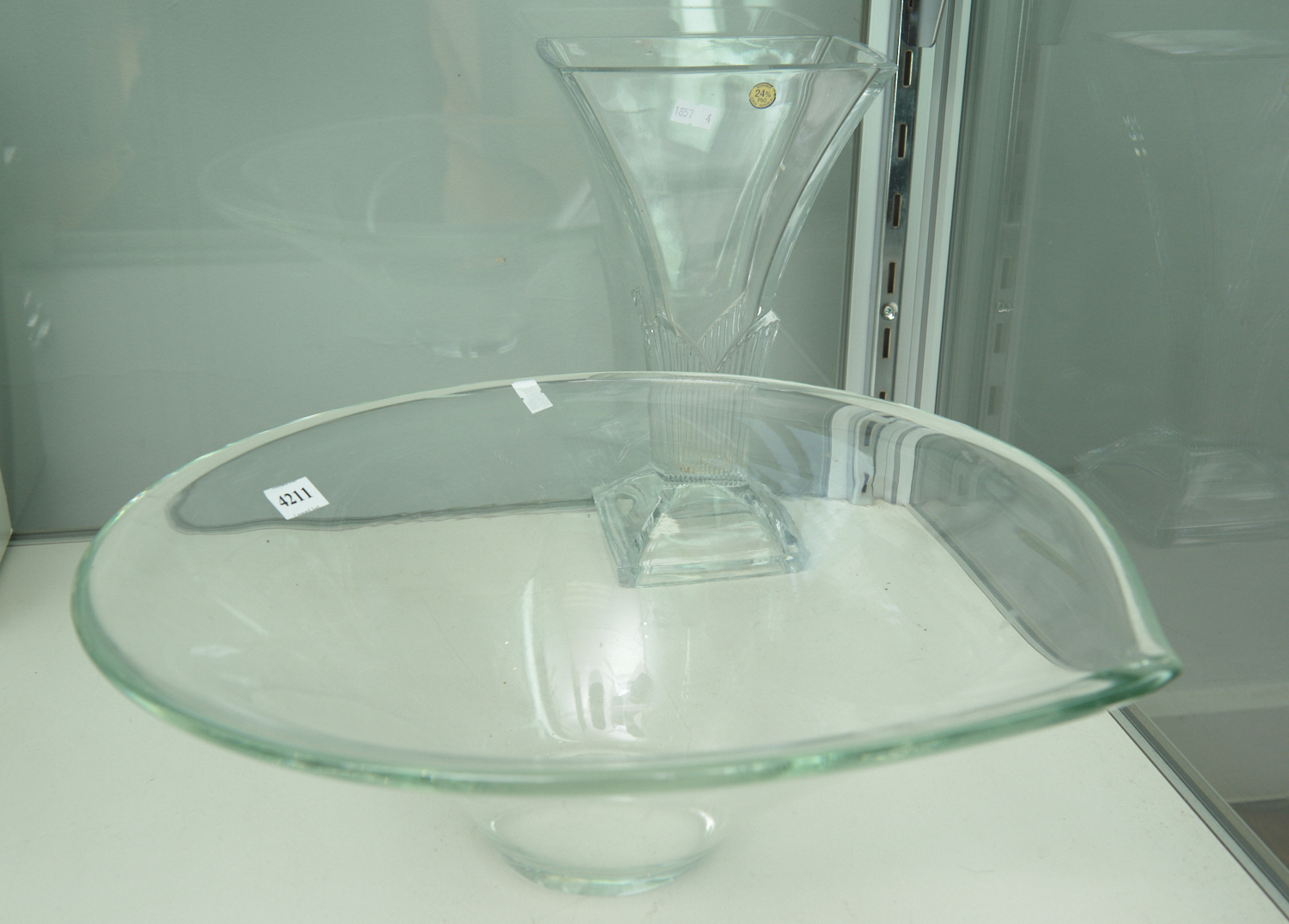 A LARGE MODERN LEAF FORMED CENTER BOWL DIA.40CM AND A BOHEMIA GLASS VASE