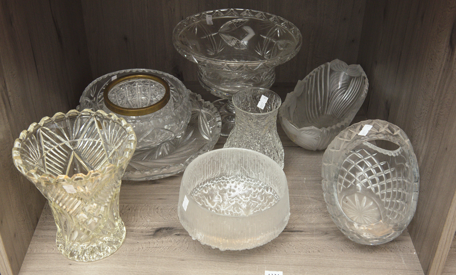 A SHELF OF CRYSTAL WARE INCLUDING CENTRE BOWLS, BASKETS, DISHES AND VASES