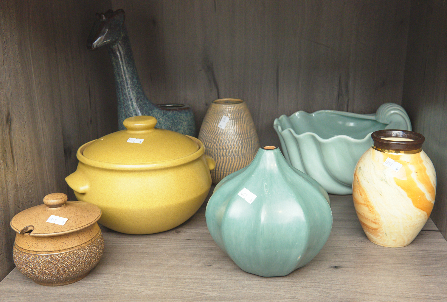 A SHELF OF POTTERY ITEMS INCLUDING DENBY, A SHELL FORMED BOWL, AND GIRAFFE VASE