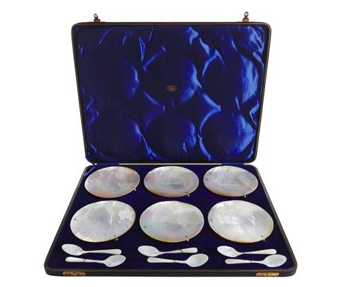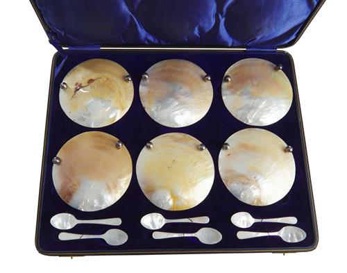A HANDSOME CASED SET OF SCOTTISH PEARL SHELL CAVIAR BOWLS AND SPOONS