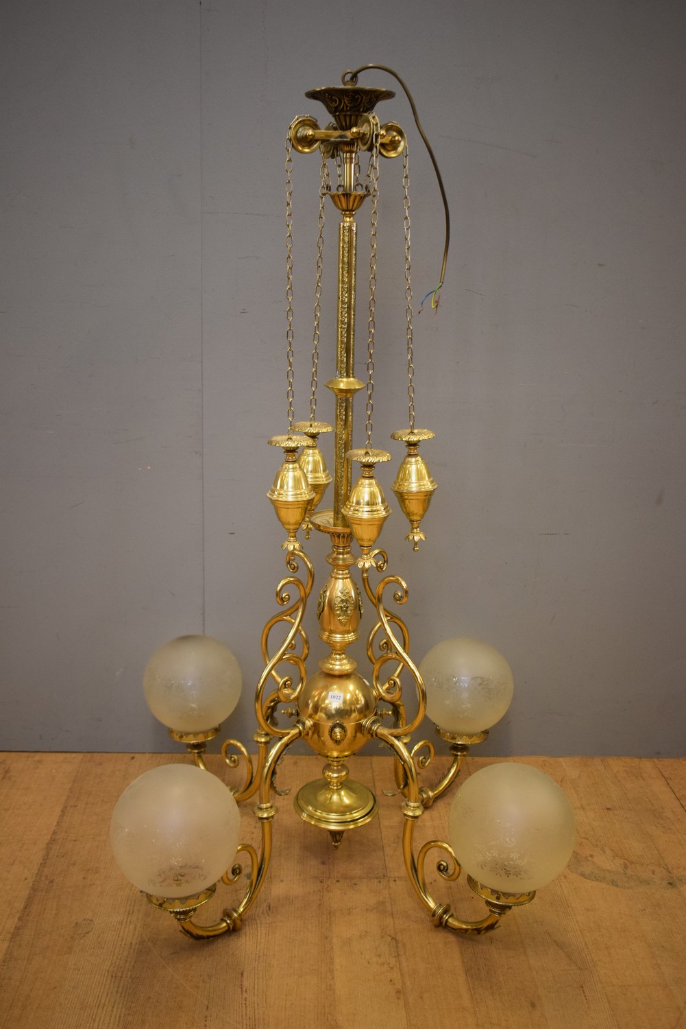 AN ANTIQUE VICTORIAN BRASS FOUR BRANCH CHANDELIER WITH GLASS SHADES (135H X 70D APPROX CM)